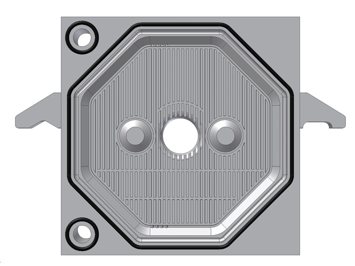 Chamber and membrane filter elements are made according to DIN 7129. Together with filter clothes they form the “Verfahrensraum” of “Kuchenfiltration” of the filter press.
